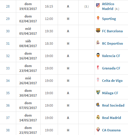Así las cosas, al Sevilla F.C. le quedan 11 encuentros de aquí al final de Liga, por los 13 del Atlético o los 14 del Barça y el Madrid, pues uno tiene que disputar la final de la Copa del Rey y el otro el partido aplazado ante el Celta. Si bien, el Atlético podría llegar a los 16, y a los 17 culés y merengues.