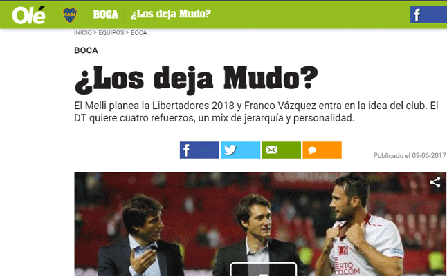Lo que asegura la citada información es que el último rival del Sevilla en el Trofeo Antonio puerta quiere reforzarse para luchar por la Libertadores, que tiene un fuerte interés en el 'Mudo' y que, tras las ventas de Tévez (10.500.000) y Bentancur (9.000.000) cuenta con cash.
