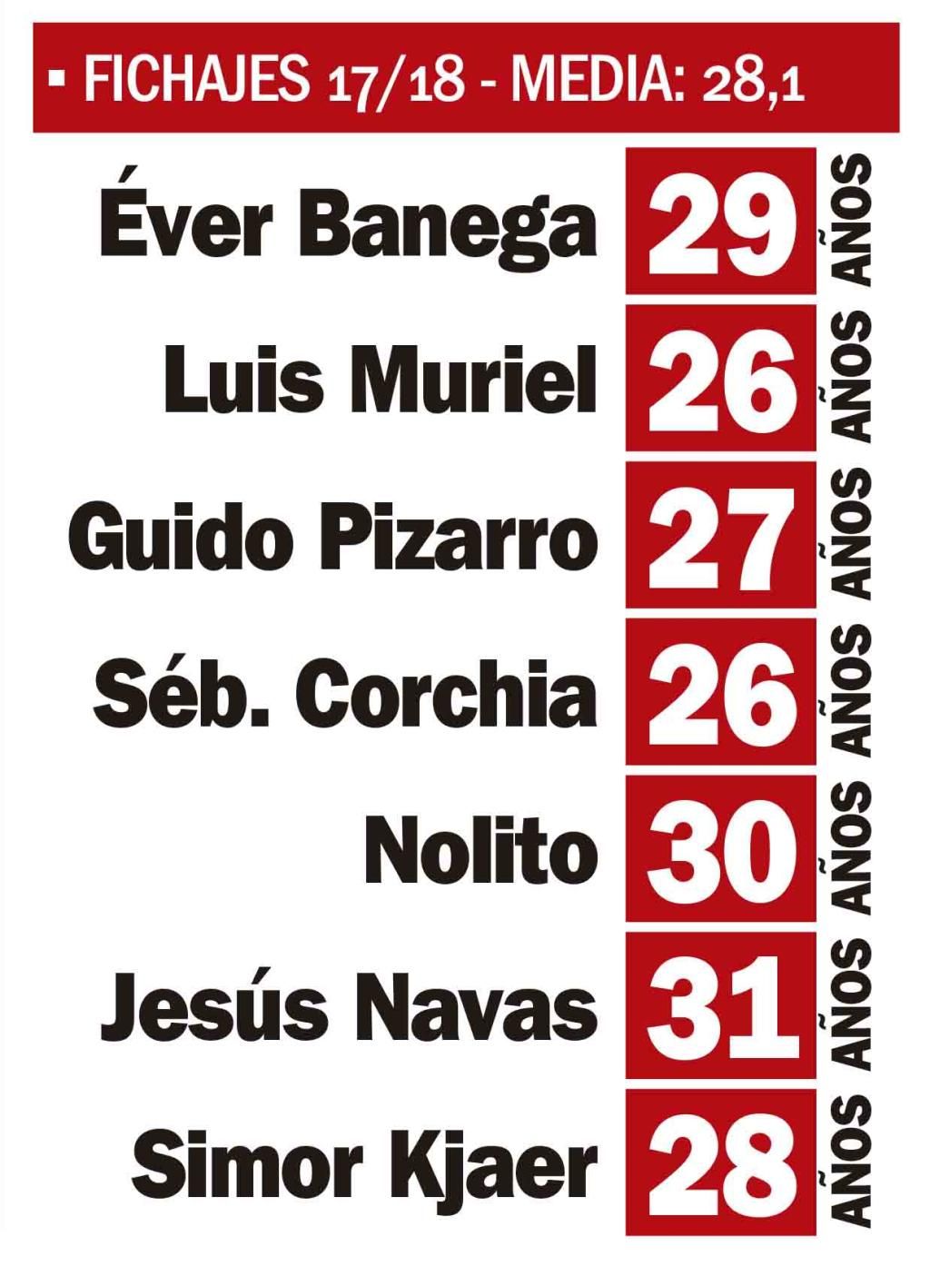 La dirección deportiva se ha decantado por minimizar el riesgos con la llegada de valores seguros en detrimento de las apuestas realizadas años atrás, con el aterrizaje de futbolistas jóvenes, como el de Correa en el verano anterior. En este sentido, no ha llegado nadie de menos de 26 años, por los cuatro de la 16/17, siendo Muriel y Corchia, con 26 años, lo más jóvenes, si bien cabe decir que a última hora se frustró la contratación de Jordan Amavi, que, a sus 23 años, respondía al perfil de fichaje con margen de cara al futuro.