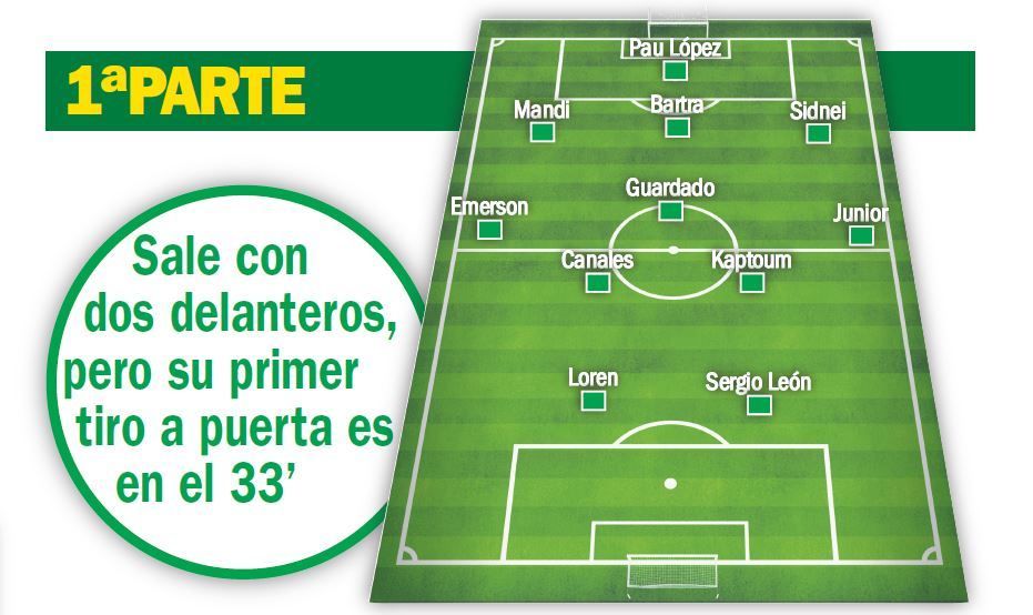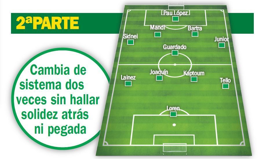 De inicio, aparcó el 1-4-1-4-1 que opuso al Valencia, pero realizó cinco cambios en el once del domingo (Emerson, Sidnei, Canales, Loren y Sergio León) y usó la variante del habitual 1-3-4-2-1, con dos puntas, un centro del campo con dos volantes y Guardado de pivote, escoltado por dos carrileros y por delante de tres centrales. No funcionó. Sólo el azteca tenía la garra necesaria para plantar cara a la poblada medular del Levante, que entraba con facilidad por la derecha castigando a un Junior sin ritmo tras su lesión. Pese a ello, fue el elegido por delante de un Tello en buen momento, que estará preguntándose qué tiene que hacer para ser titular en el Betis.