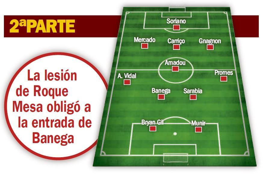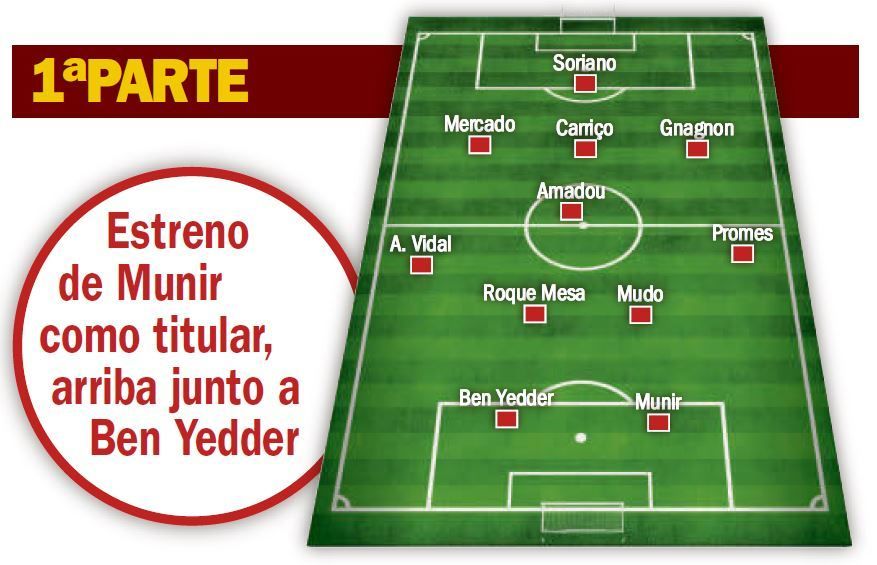 Lejos de las zonas prohibidas y con un equipo cargado de jugadores menos habituales, pensando Pablo Machín en el duelo liguero del próximo sábado ante el Real Madrid, los de Nervión dieron un paso adelante tras el paso por vestuarios, gozando Aleix Vidal de bastante más profundidad por banda y consiguiendo conectar en alguna que otra ocasión con un Munir El Haddadi que se estrenaba como titular tras su reciente fichaje y que se mostró muy participativo.