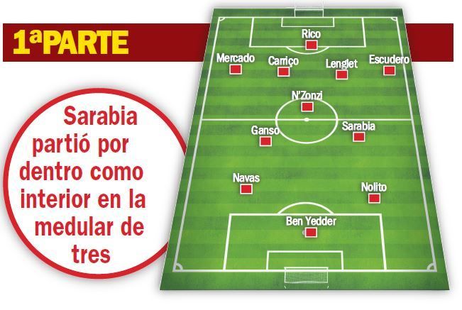 Avance que facilita, sin duda, disponer de una fuente inagotable de recursos merced al talento de la plantilla, aunque de nada serviría sin una gestión adecuada, tarea en la que el técnico de Cruz Alta muestra excelentes maneras. Ayer, ante las bajas en la medular, armó de clase el juego interior con Ganso y Sarabia a ambos lados de N'Zonzi, lo que propició un arranque dubitativo ante la intensa presión de los armeros pero a la larga concedió los réditos esperados por el 'Toto'.