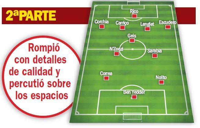 En la circulación faltaba, aunque resulte extraño, más dinamismo que profundidad, pues la ausencia de chispa en la posesión estática frente a un ordenado rival la compensaban los chispazos de Ganso y Sarabia, que pusieron de gol a un activo Ben Yedder y a Nolito con dos delicados servicios. Funcionaba quizás a impulsos un Sevilla sin un timonel claro en el centro del campo, situación que no repercutía en el sistema de contención, que evidenció que Berizzo lo trabaja con esmero.