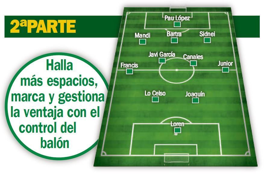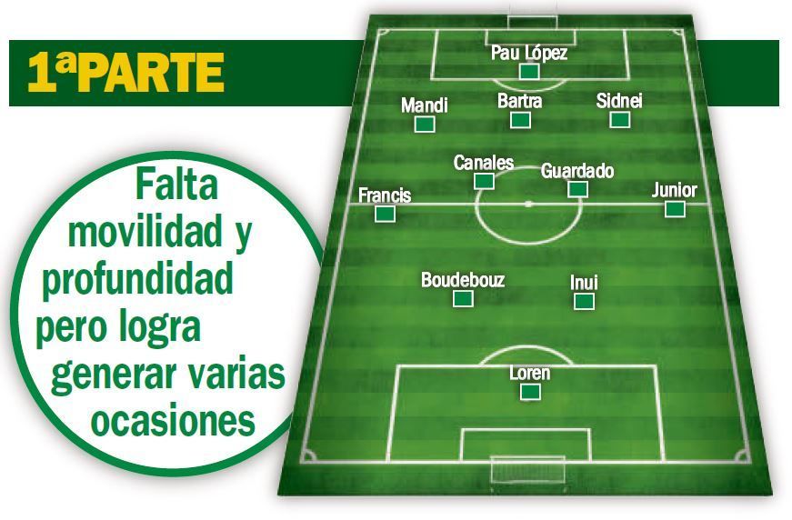 Pretendía verticalizar la propuesta con Canales al timón y una pizca escorado a la derecha pero con libertad de movimientos y apoyado por Guardado, un poco más anclado en la medular. El guion era el mismo que en choques anteriores, con un monopolio bético en la posesión ante un Girona dispuesto a replegarse para recuperar, y en el arranque se vislumbró la intención de minimizar el tráfico en zonas intrascendentes con pases interiores, pero, ante el encierro catalán, la circulación se espesó y se convirtió en una sucesión de entregas horizontales ante la ausencia de movimientos en posiciones avanzadas.