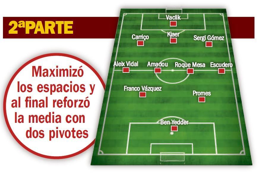 En la tarde de ayer no contaba con Jesús Navas, principal motor de la teoría del soriano de atacar mucho para que de la cantidad salga la calidad, por lo que las percusiones por banda se repartieron. Mientras Aleix entraba en el partido, Sarabia asumía su función hasta el punto de asistir en el gol del triunfo, y Escudero se proyectaba con profundidad por la izquierda.
