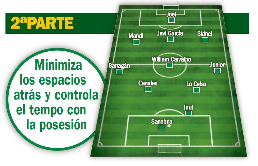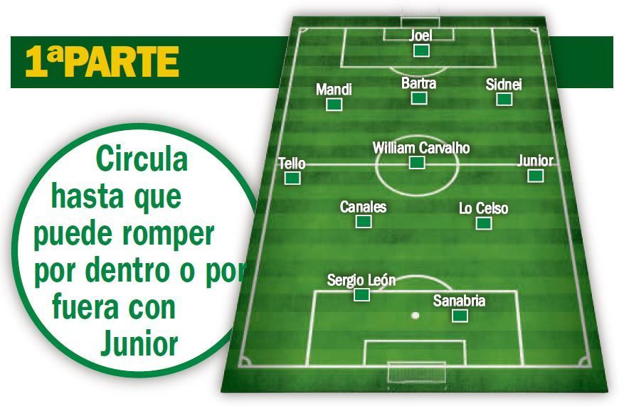 El portugués se alió con Canales, siempre muy dinámico y con la misma intención de limitar la horizontalidad mientras que Lo Celso aportó ese plus de visión que tanto se necesita para no dormirse con el balón. Entre ellos se entienden, con circulaciones por dentro que, en muchas ocasiones, tendieron hacia fuera por las subidas de Junior. No obstante, al Betis, como es habitual, le faltaba esa última conexión con el ataque, ayer con dos puntas, déficit resuelto con Canales con el 1-0 habilitado por uno de los delanteros, Sanabria.