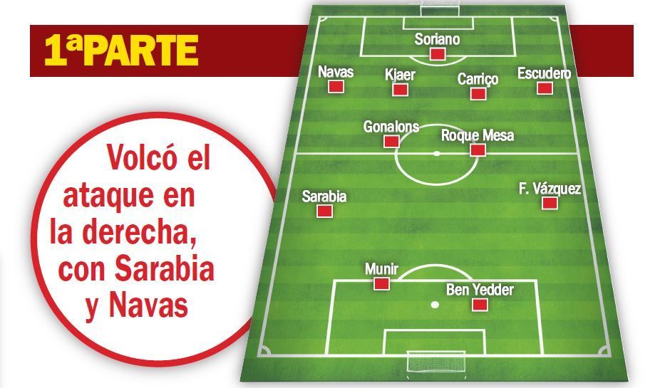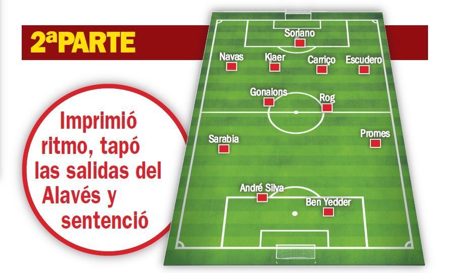 Con el Alavés anulado, el Sevilla se volcó por la derecha, en la que Navas golpeaba por fuera y Sarabia ocupaba los espacios y se entendía con el palaciego. Se iniciaba sobre todo con Gonalons, que ante la poca presencia del Mudo, que partía desde la izquierda en un 4-4-2, descargaba en la diestra. Roque tenía permiso para dar un paso al frente para crear superioridades en zonas de influencia y por ahí llegó el primero. Con 1-0, mantuvo la intensidad en la reanudación e incluso subió el ritmo, siempre por la derecha y sin conceder ni una contra, lo que condujo a la sentencia y a la sensación de que este Sevilla es exprimible.