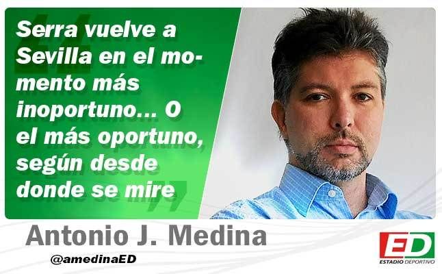 Serra Ferrer vuelve a Sevilla. Aunque no sea a propósito y ni mucho menos el balear busque el protagonismo que siempre se le da, hay quien piensa mal. Serra no sólo regresa sino que, posiblemente, acuda a ver mañana al Betis. Es lógico cuando de sobra es reconocido su beticismo, es socio, accionista... pero el momento es poco propicio. O tal vez no, porque esos mismos que piensan mal creen que se ha elegido justo este momento, aunque la Peña de Gilena, que le va a hacer un homenaje, tramitara la invitación hace un mes, cuando nada hacía prever la situación que ahora vive el club.