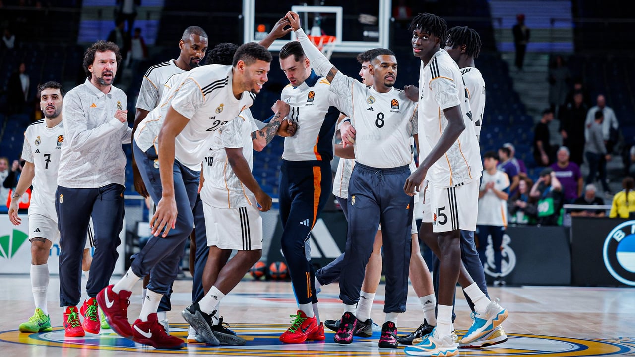 Los jugadores del Real Madrid de Baloncesto celebran una victoria @RMBaloncesto