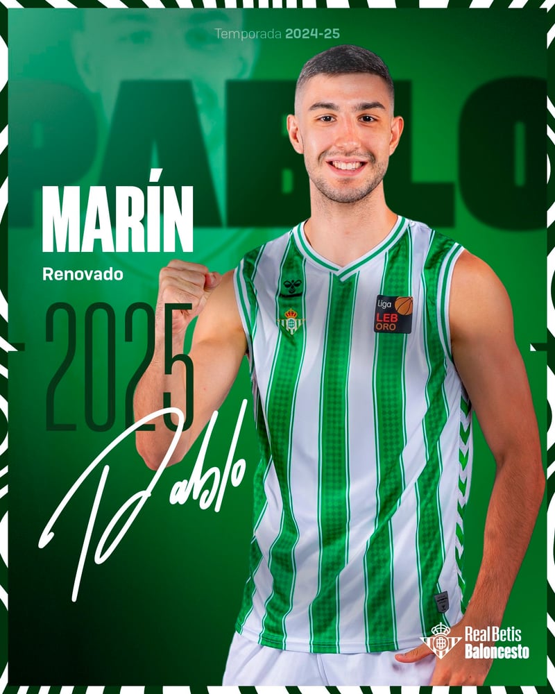 Pablo Marín, de 22 años, prolonga su estancia en el equipo de las 13 barras por otra temporada más, hasta 2025. El jugador lleva varios años en el club, ya que formó parte de la cantera en su paso por las categorías inferiores. Después, durante cuatro años estuvo cedido en otros equipos para seguir cogiendo minutos en partidos importantes y así conseguir una progresión. En 2023 regresó al Betis y fue ganándose minutos con el primer equipo, siendo cada vez más importante para la consecución de buenos resultados.
