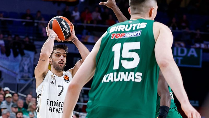 La primera mitad del Real Madrid se podría resumir en un continuo remar en ataque y defensa, haciendo muchas cosas bien para llegar a distancias en torno a los diez puntos y para luego ver cómo se la reducía de un plumazo el Zalgiris a base de triples.