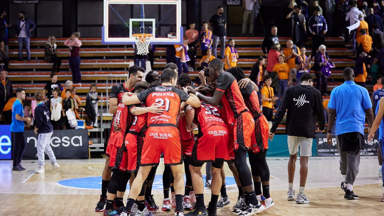 Los jugadores rojinegros celebran la victoria.Fermín Rodríguez / Fundación CB Granada