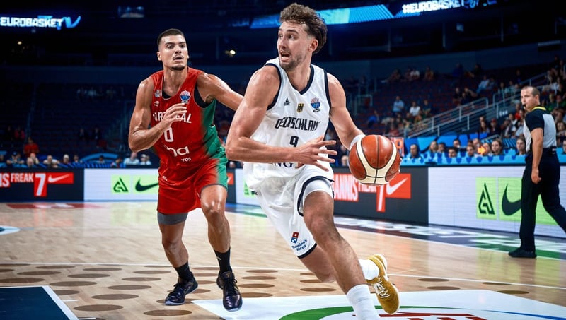 Más problemas de los previstos tuvo también Alemania ante Portugal en el segundo de los encuentros de la jornada. El conjunto que dirige Álex Mumbrú, ya en el banquillo tras superar una infección, llegaba como claro favorito. Pero sus pésimos registros en el lanzamiento exterior (1 anotado de los primeros 24 intentados) y la buena defensa de su rival hizo que se marcharan al descanso con solo 31 puntos.