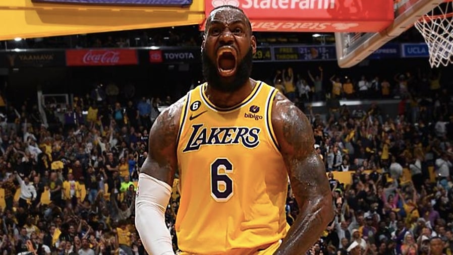 LeBron James, celebrando una canasta con los Lakers@Lakers