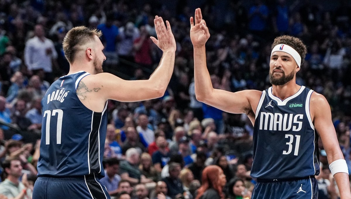 Luka Doncic y Klay Thompson celebran una canasta en su estreno@dallasmavs