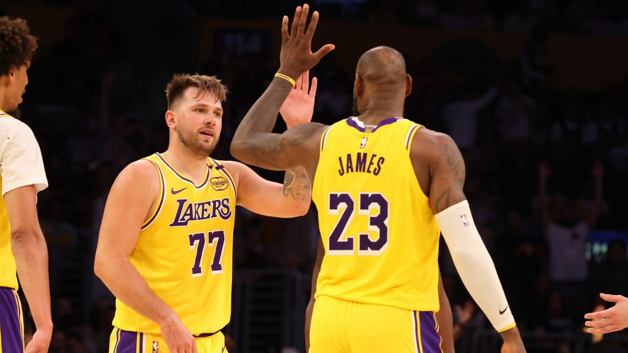 Luka Doncic y LeBron, durante un partido juntos en Lakers.CORDON PRESS