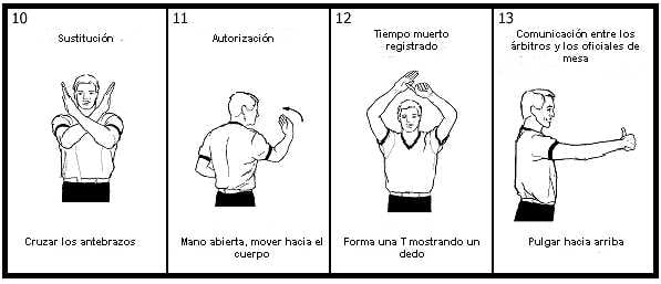 - Fin del cuarto/partido: El árbitro levanta los brazos y los agita, indicando que ha terminado el cuarto o el partido.