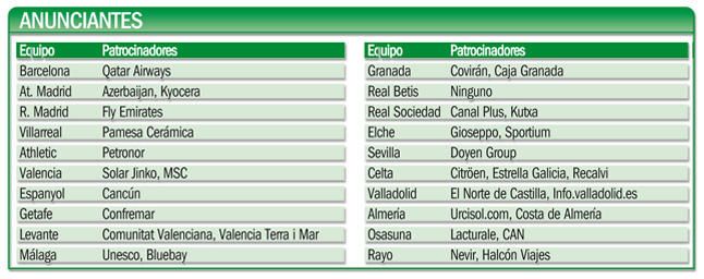 Su situación contrasta con la de otros equipos de la categoría que tienen el respaldo de hasta tres anunciantes. Es el caso del Celta de Vigo, que lleva la firma de Citroën en la parte frontal de la zamarra, la de Estrella Galicia en la zona lumbar y la de Recalvi en las calzonas. La mayoría cuenta con dos ´sponsors´ (Atlético de Madrid, Valencia, Málaga, Granada, Elche, Almería, Osasuna...), aunque otros rentabilizan de sobra el espacio con sólo uno, como por ejemplo el Real Madrid, que recauda 25 millones de euros al año procedentes de Fly Emirates, o el Barcelona, que ingresa alrededor de 30 gracias a Qatar Airways. Basta con mencionar los dos millones que paga Petronor al Athletic de Bilbao para comprobar la diferencia abismal que existe entre los colosos y el resto en este apartado (y en todos).