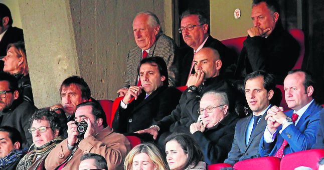 Felipe Miñambres, sentado en el palco de autoridades junto al entrenador rayista, Paco Jémez.O.M.