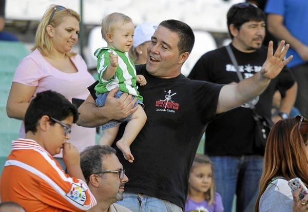 Hay quien dice que el bético no se hace, que nace, que se es bético desde la cuna. Ayer se pudo comprobar de primera mano en la sesión de entrenamiento que se celebró en el estadio a puerta abierta, a la que estaban invitados todos los socios del club menores de 14 años. Alrededor de unos 200 se acercaron hasta el Villamarín, destacando la presencia de una pequeña de apenas unas semanas de vida, que ya lucía con salero su camiseta de las trece barras con su escudo en el pecho.