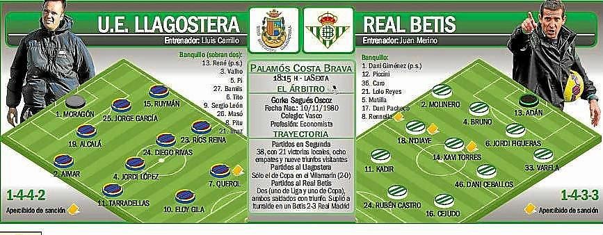 Llagostera: Moragón, Aimar, Alcalá, Jorge, Ruyman, Jordi López, Diego Rivas, Tarradellas, Ríos Reina, Eloy Gila y Querol.
