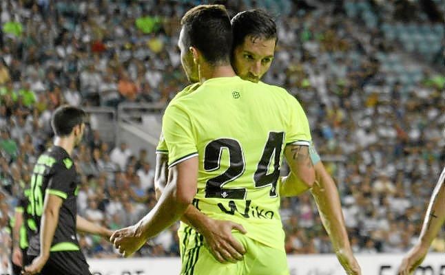 El Betis se impuso ayer al Sporting de Portugal por 2-3 en un nuevo amistoso estival del conjunto que dirige Gustavo Poyet. El cuadro verdiblanco continúa sin perder en la presente pretemporada, y esta vez se llevó la victoria ante uno de los principales equipos de Portugal, gracias sobre todo a la actuación de su delantero talismán: Rubén Castro. El atacante canario anotó un 'hat-trick' para brindarle el triunfo a los heliopolitanos, que comenzaron perdiendo tras el gol de Alan Ruiz para los lusos, pero que vencieron en un choque cuyo marcador cerró Slimani a quince minutos de la conclusión. Además, Manu Herrera y Roman Zozulya debutaron con el club de La Palmera, que en esta ocasión lució su tercera equipación por primera vez este verano.