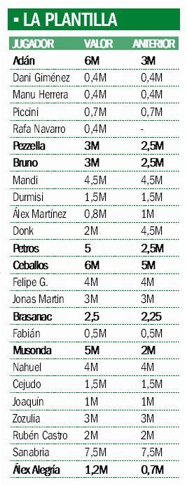 Los jugadores con mejor cartel en el mercado, por el interés de equipos que ha llegado sobre ellos son Petros (Celta y Valencia, en España), Adán (Liverpool o Marsella), Ceballos (Atlético de Madrid) o Pezzella (cotizado en la Serie A) son, precisamente, los que más suben. Ellos ejemplifican bien el camino que se persigue con la política deportiva. También han subido de valor Bruno, Musonda -que está cedido por el Chelsea, por lo que un traspaso no repercutiría en el Betis- y los canteranos Álex Alegría, tasado ya en más de un millón de euros, y Rafa Navarro.