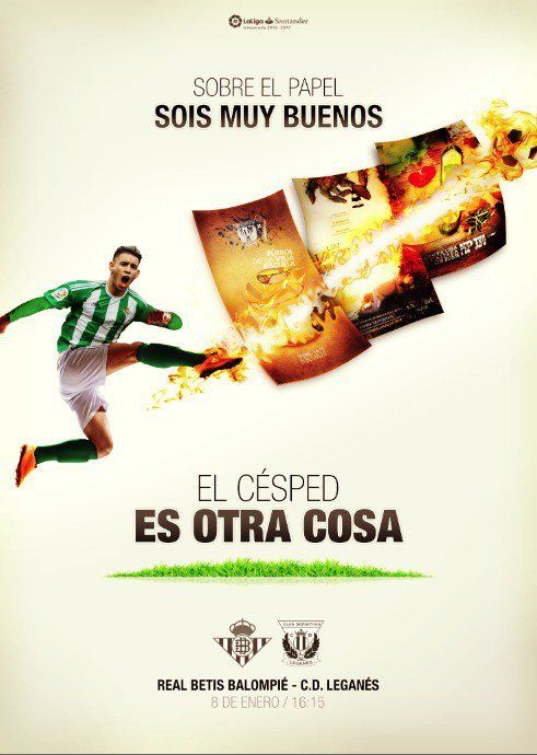 El departamento de comunicación del Real Betis ha presentado en las redes sociales un curioso cartel del encuentro entre el Real Betis y el Leganés de este domingo a las 16:15 h. Utilizando el habitual ingenio del equipo comunicativo pepinero, el Betis lanza un mensaje en el que afirma que en "papel son muy buenos, pero que en el césped es otra cosa", haciendo alusión a la aguda capacidad del cuadro madrileño en las previas de los partidos del cuadro de Garitano. Parece que el Betis le lanza un reto al Leganés, habrá que estar atentos a la respuesta del siempre imaginativo conjunto pepinero.
