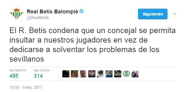 El Real Betis Balompié ha querido "condenar" los "insultos" del concejal del Grupo de Participa Sevilla en el Ayuntamiento hispalense, Julián Moreno, hacia Zozulya, mediante un pequeño comunicado emitido en la cuenta de twitter del club.