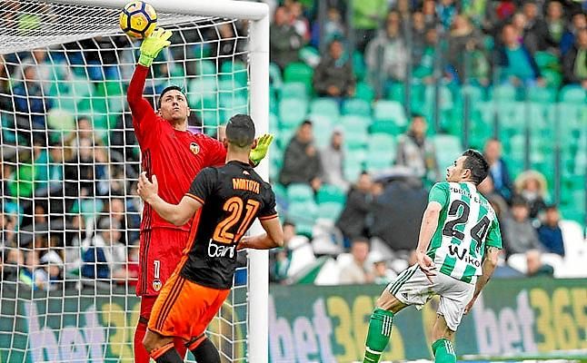 Empate sin goles entre Betis y Valencia. En una mañana fría y pasada por agua, y en un partido con más ocasiones que juego, los dos equipos buscaron el gol pero ambos porteros y, sobre todo la madera en el caso verdiblanco, lo evitaron