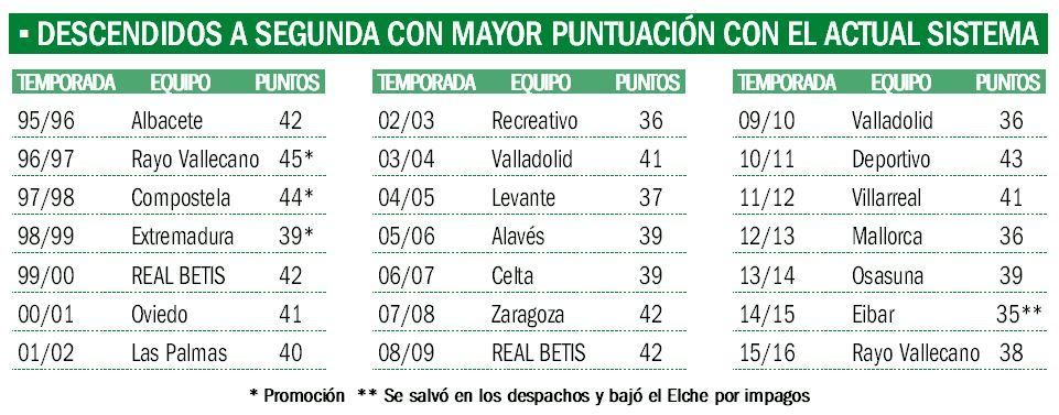 A este ritmo, la proyección en la Avenida de La Palmera rozaría los 41 puntos (40,9 para ser precisos), un listón modesto, aunque seguramente suficiente para asegurar la continuidad en la elite del fútbol español una temporada más. Bien es cierto que, en diez de los veintiuno ejercicios con el actual sistema de baremación, el Betis habría perdido la categoría (el 11/12, el 10/11, el 08/09, el 07/08, el 03/04, el 00/01, el 99/00, el 97/98, el 96/97 y el 95/96, primero en el que se otorgaron tres puntos por victoria). Incluso, el propio conjunto verdiblanco se fue al 'infierno' con 42 puntos en dos ocasiones, pero las estadísticas indican que en la 16/17 harán falta muchos menos para estar tranquilos en Primera división.