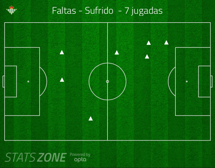 Es por ello que los equipos que se enfrentan al Betis suelen frenarlo mediante infracciones. Saben que, si Ceballos alcanza con la pelota en los pies los tres cuartos de campo, puede suceder algo, y tratan de evitarlo por todos los medios. En la última jornada, ante Osasuna, por ejemplo, fue el hombre de campo que recibió más faltas, siete (gráfico 1), aunque es una estadística habitual desde que Víctor se ha hecho cargo del equipo verdiblanco.