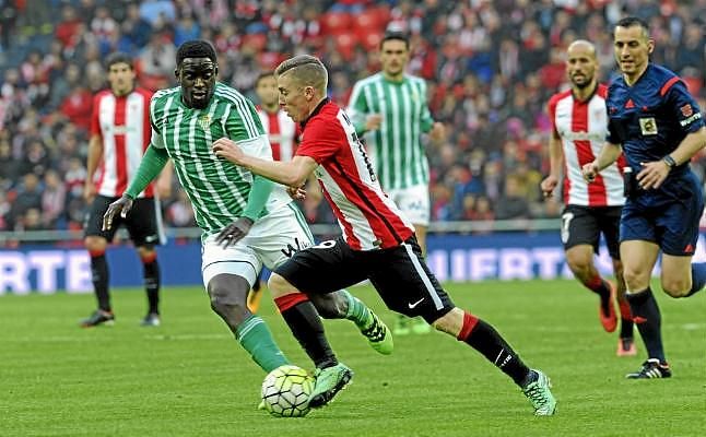 Iker Muniain se marcha de Alfred N´Diaye durante la última visita bética a San Mamés.R. S.