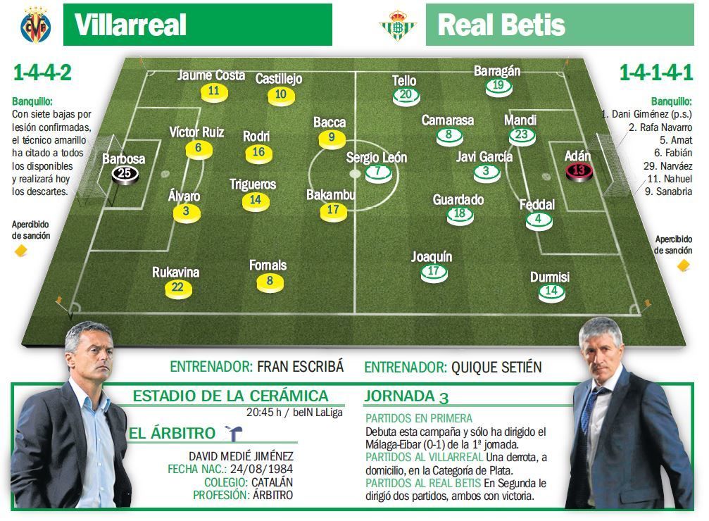 No cabe duda de que los amarillos querrán resarcirse de este nefasto arranque en el estreno ante su público, aunque Fran Escribá, que duda en ataque entre Bakambu y Sansone, con Bacca fijo, seguirá lamentando numerosas bajas: Bruno Soriano, Mario Gaspar, Cheryshev, Roberto Soriano... y los metas Andrés Fernández y Asenjo, lo que deja bajo palos a Mariano Barbosa, un portero poco acostumbrado a competir al que habrá que probar.