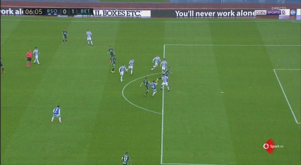 Fue una primera parte loca porque la Real y el Betis necesitaron pocos pases para instalarse en campo contrario. Ambos juegan con muchos futbolistas por delante del balón y acabaron atacando mejor que defendiendo. Mucho mejor. Por eso, y porque a los verdiblancos se les da de maravilla lo de centrar y rematar de cabeza (siete de sus 12 goles han sido de cabeza), llegó pronto una nueva igualada. La puso Joaquín desde el córner y remató Feddal con su testa (28´). Reacción veloz y oportuna. 2-2 y sensación de que podía pasar cualquier cosa.