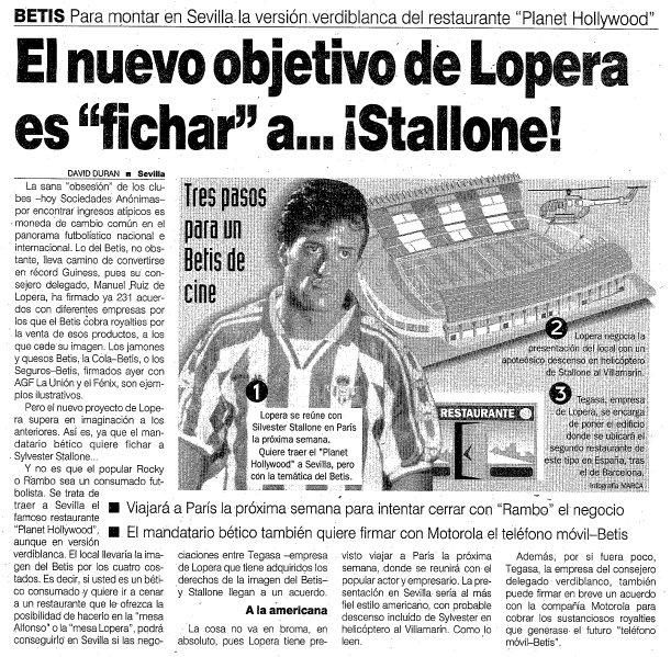 El interés de Lopera por Stallone no era futbolístico, a pesar de que este había protagonizado Evasión o victoria. El protagonista de Rocky era el dueño de la franquicia de restaurantes Planet Hollywood y Lopera quería montar uno en Sevilla. La idea del ex presidente para el restaurante estaba totalmente ligada al fútbol, ya que este Planet Hollywood tendría temática verdiblanca y sería una especie de "Planet Betis".