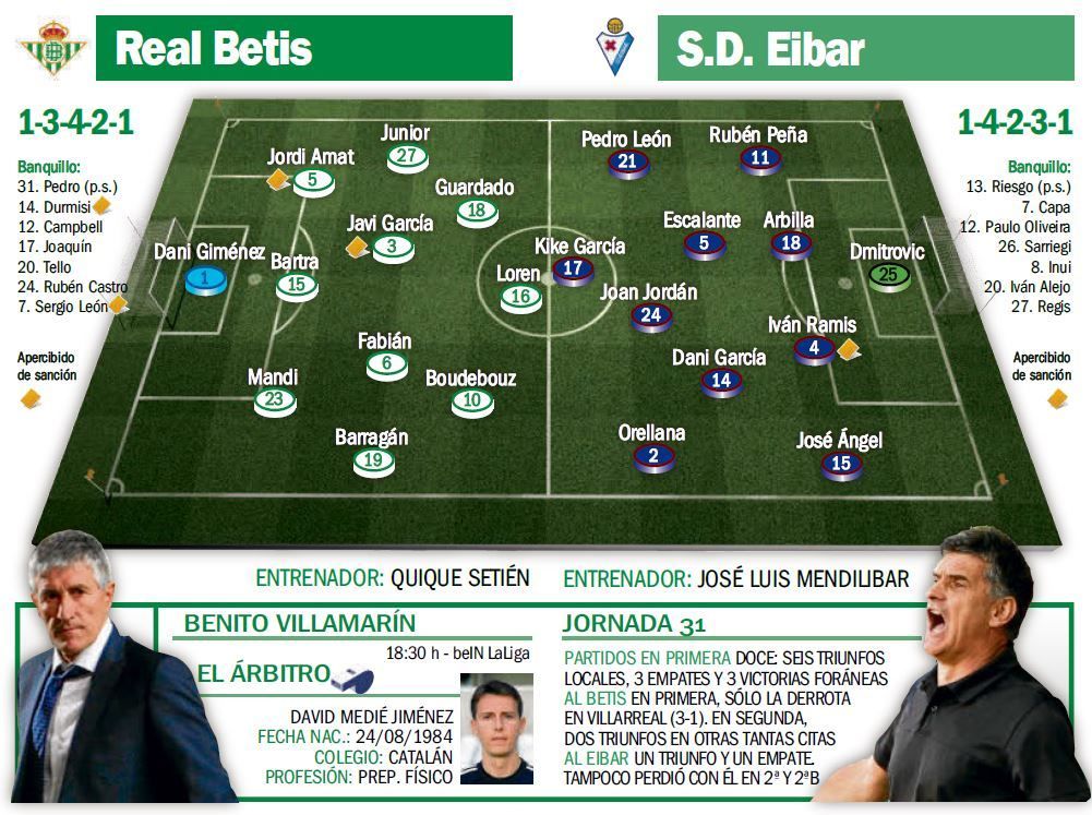 Con todo, no está del todo claro quién le dejaría su sitio en el once, pues Boudebouz, quizás el más flojo el pasado lunes, es otro de los líderes heliopolitanos y uno de los catalizadores más dotados. La inclusión del portuense sería más sencilla con el 1-4-3-3, giro nada desdeñable al jugar el Eibar con un solo delantero, pero que contrasta con el deseo de Setién de alterar lo justo y necesario lo que funciona. Y está claro que el dibujo con tres centrales otorga seguridad y una salida más limpia al Betis, candidato a Europa con todas las de la ley.