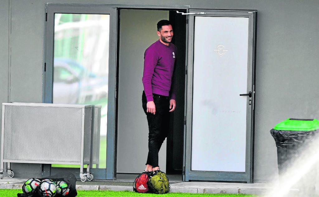 Adán observa un entrenamiento del Betis tras ser operado.E. G./A. T.