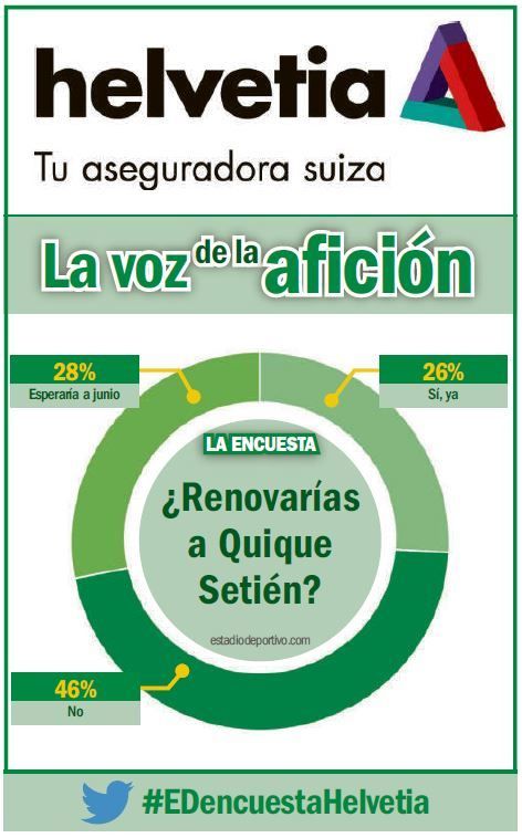 de su página web estos días una encuesta a raíz de la información de que el ​Betis ha iniciado los contactos con Quique Setién y su entorno para ampliar su vinculación contractual, que expira el 30 de junio de 2020. Si hoy preguntamos sobre la opinión de los aficionados béticos acerca de lo que creen que hará el club de aquí al final de la presente campaña, en la anterior se les cuestionaba acerca de lo que ellos harían en su lugar.