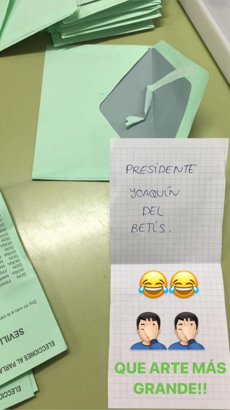 Si Joaquín un día decide meterse en política seguro que tendría mucho tirón. De hecho, sin hacerlo, ya ha tenido un 'voto'. Ocurrió ayer en las elecciones para la Junta de Andalucía. La imagen, seguramente captada durante el recuento, llegó al jugador del Betis, que no dudó en compartirla en su cuenta de Instagram. "Presidente. Joaquín, el del Betis", se lee en el voto que, lógicamente, fue contabilizado como nulo.