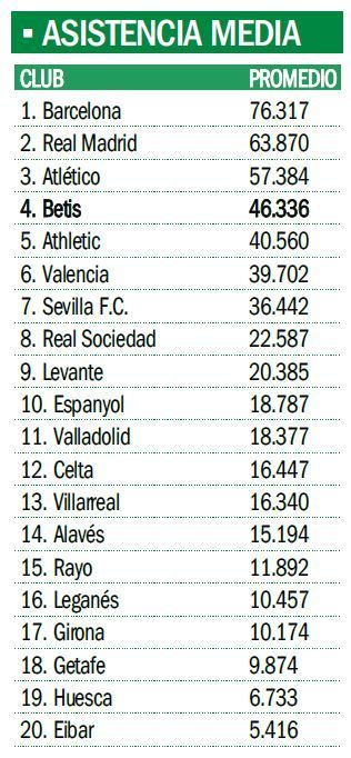 De este modo, el Betis alcanza los 46.336 espectadores de media en estos 17 primeros partidos de LaLiga, por los 57.384 del feudo del Atlético, los 63.870 del madridista y los inalcanzables 76.317 del fortín del Barça. Por detrás, aparecen históricos como el Athletic, quinto, o el Valencia, sexto.