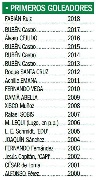 con acento castellano. Y es que la primera alegría de la parroquia heliopolitana suele venir de la mano de futbolistas españoles. Así ha sido en los seis últimos años: cuatro veces por medio de Rubén Castro, quien inaguró la cuenta anotadora de los verdiblancos en 2017, 2015, 2014 y 2013; con Álvaro Cejudo, en 2016 y con Fabián Ruiz como primer realizador de 2018 con un gol inolvidable: por haberlo logrado en el estadio del eterno rival (cuyo marcador reflejó un 3-5 al término del choque) y cuando únicamente habían transcurrido 21 segundos, con lo que se convirtió en el tercer tanto más rápido de la historia del club sólo por detrás de los de Rubén en 2014 al Zaragoza (a los 14 segundos) y el de Suárez al Málaga en los años 80 (a los 13”).