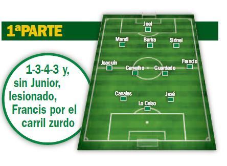 Quique Setién salió a Mestalla sin una referencia clara arriba, jugando con falso ‘9’ en un 1-3-4-3 en el que Jesé actuaba principalmente como interior izquierdo y en el que Canales y Lo Celso intercambiaban sus posiciones con asiduidad. Con Francis en la izquierda ante la ausencia de Junior por lesión, Joaquín ocupó el costado derecho, buscando por ahí sus oportunidades el Valencia, que intentaba jugar en pocos metros y saliendo rápido a la contra.