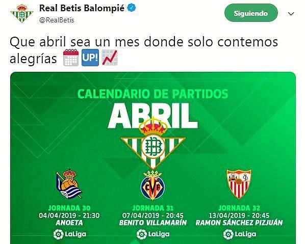 Así, a once días de que arranque el Sevilla-Betis, los prolegómenos del partido ya han comenzado por Twitter. Todo este anecdótico acontecimiento se derivó tras la publicación del Real Betis de su calendario del mes de abril, donde incluyó una imagen del escudo del Sevilla errónea que no se ajustaba a su imagen corporativa actual. El Community Manager del Sevilla F.C. contestó al tuit del CM verdiblanco recordándole este hecho y avisándole del error en la publicación.