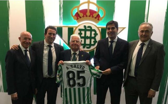 Antes de que comenzara el partido, Calvo, acompañado por el director de comunicación del Betis, Julio Jiménez Heras, saludaba en el terreno de juego a compañeros de profesión y a miembros y amigos del club como el delegado del conjunto bético Víctor Antequera.