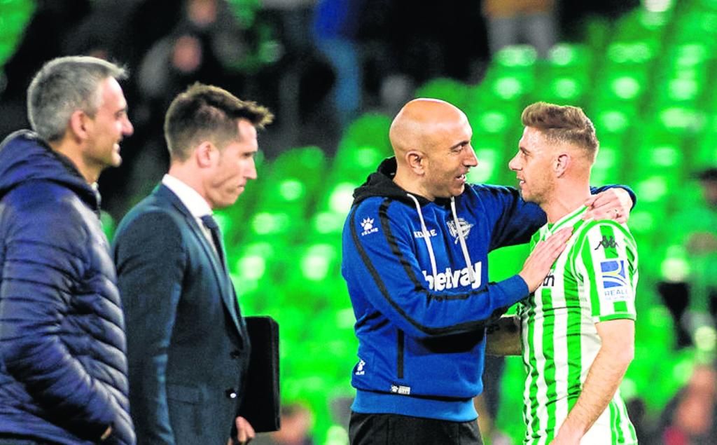 Abelardo charla amistosamente con Joaquín en el último partido entre Betis y Alavés.A. T.
