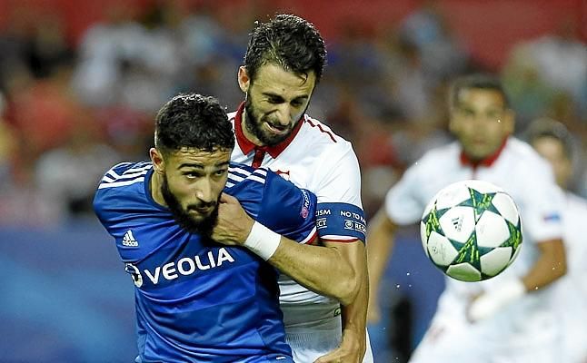 Fekir pugna con Pareja, en un Sevilla-Lyon de Champions.