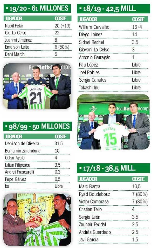 Por su parte, en la 17/18 invirtió una partida de 38,5 millones en futbolistas de la talla de Marc Bartra (10,5); Ryad Boudebouz (7, el 80%); Víctor Camarasa (7, por el 80%); Cristian Tello (4), Sergio León (3,5), Zouhair Feddal (2,5), Andrés Guardado (2,5) y Javi García (1,5); que hicieron posible la vuelta del equipo a la Europa League. El verano de 2019 ha pasado de ofrecer bromas sobre el ‘Big Data’ y ser tildado de aburrido, a dejar tintes que apuntan a que va a ser recordado durante mucho tiempo. Y es que, al margen de hasta dónde puedan elevar la inversión total las esperadas contrataciones de Borja Iglesias (o una alternativa de su nivel) y de algún que otro refuerzo más, cabe recordar que este verano en el que tan fiscalizado se siente, el club ha batido también el récord de la mayor plusvalía, ya que los 29 kilos en los que se valora el traspaso de Pau López a la Roma (23,5 más 5,5 del 50% de Tonny Sanabria) superaron los 27 de Fabián Ruiz (el Nápoles pagó los 30 de su cláusula en 2018). Y, es más, al portero aún podría dejarle sin esta marca Giovani Lo Celso, si el Tottenham cumple con su ‘amenaza’ de acercarse a los 70 millones.