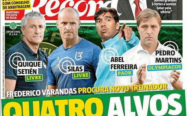 La silueta de Setién es una de las imágenes principales de la portada con la que abre este miércoles la edición impresa del diario deportivo luso 'Récord', que le sitúa en un cuarteto de opciones para hacerse cargo del banquillo de los 'Leoes', junto con Jorge Manuel Rebelo Fernandes, más conocido como Silas y que como el exbético está sin equipo, y a los actuales dirigentes del PAOK y el Olympiacos griegos, los portugueses Abel Ferreira y Pedro Martins.