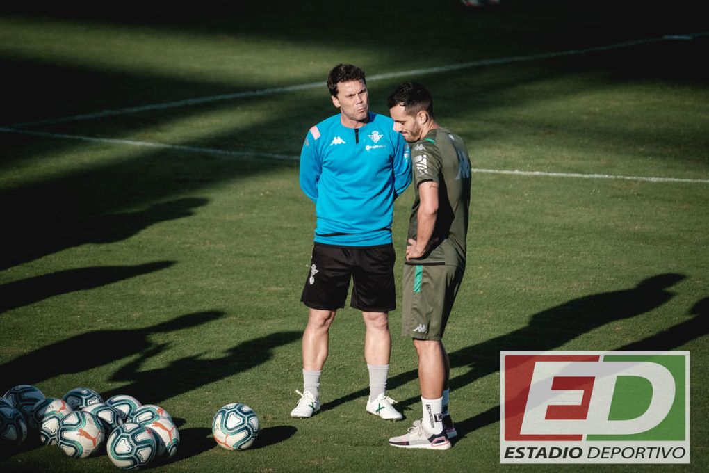 Ambos futbolistas estuvieron en la charla sobre el césped del entrenador bético, al comienzo del entrenamiento, aunque posteriormente se dirigieron a las instalaciones interiores de la Ciudad Deportiva para continuar con sus procesos de recuperación al margen del resto de sus compañeros.